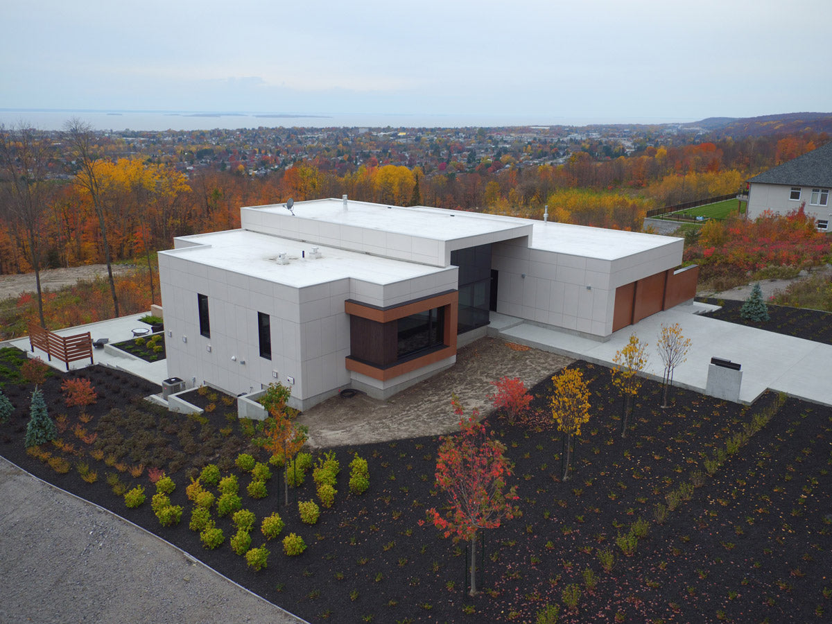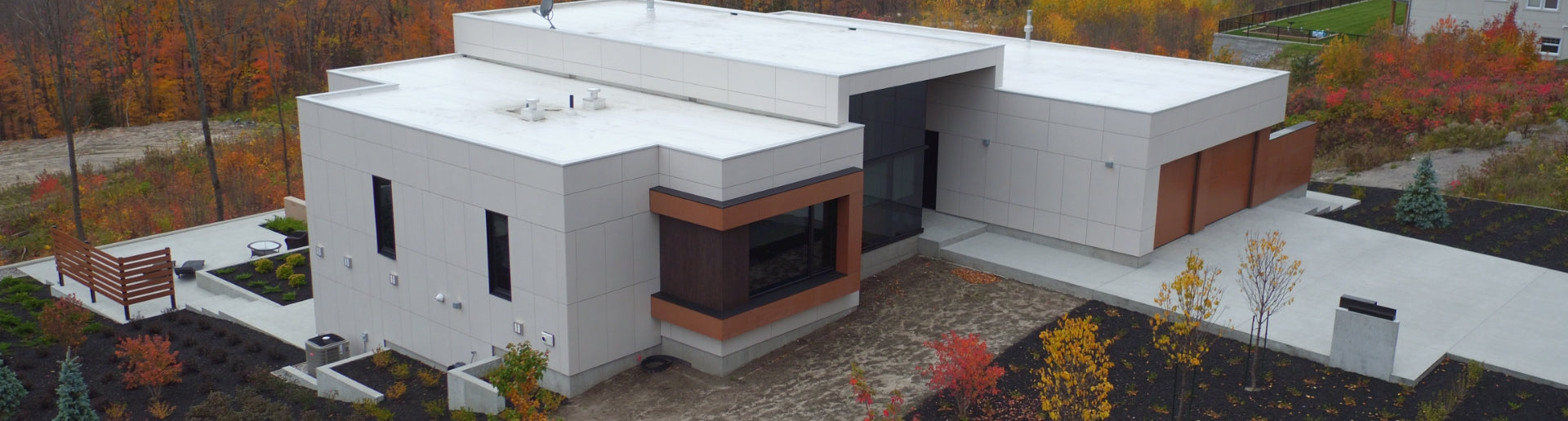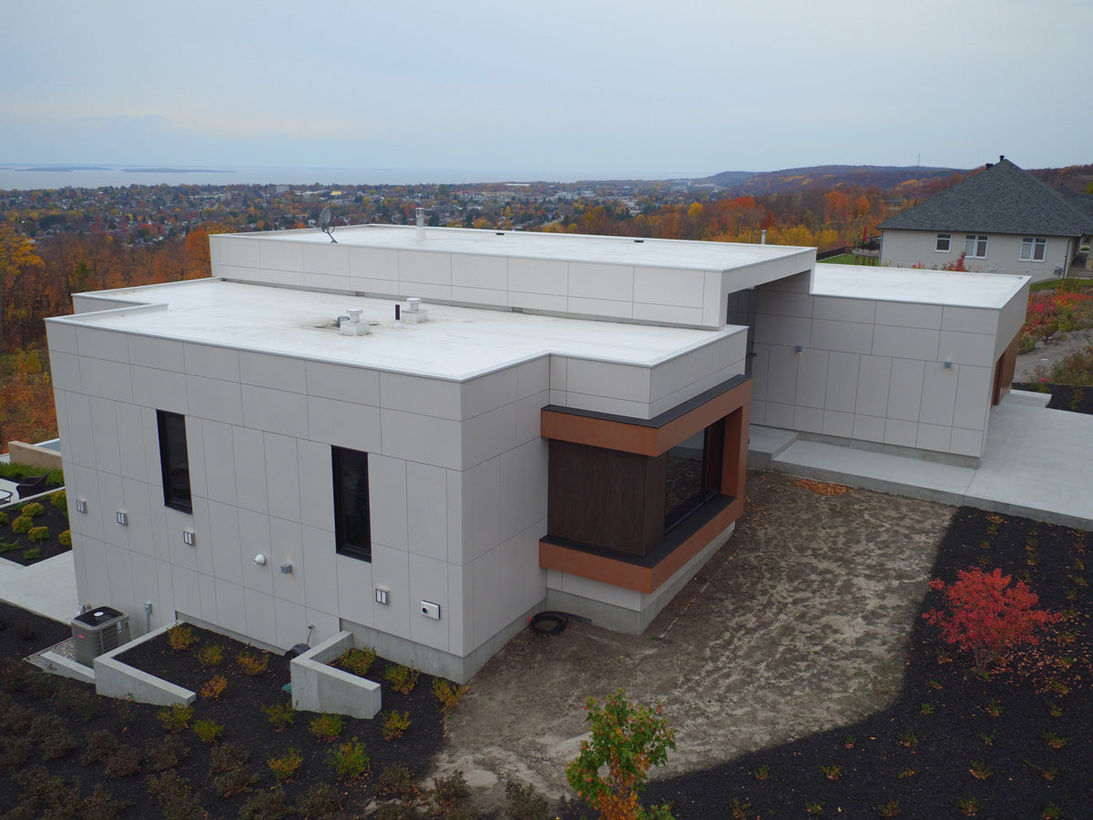 Beautiful custom home in North Bay ON designed by LEA (Larocque Elder Architects). Featuring 2 unique exterior cladding products. White Fiandre porcelain panels and woodgrain HPL(high pressure laminate) panels for accents.