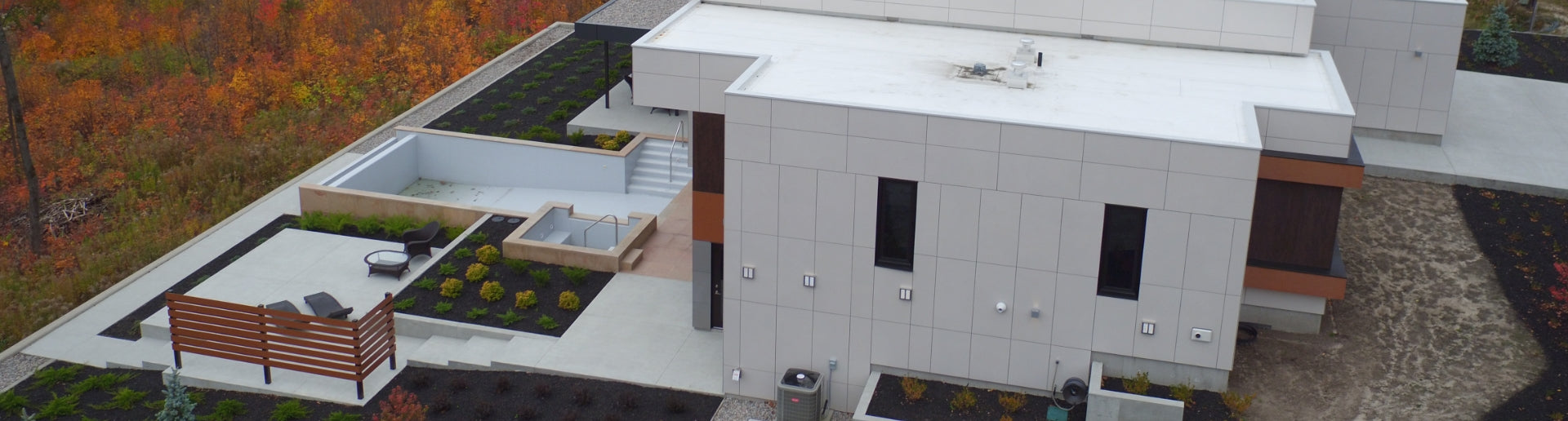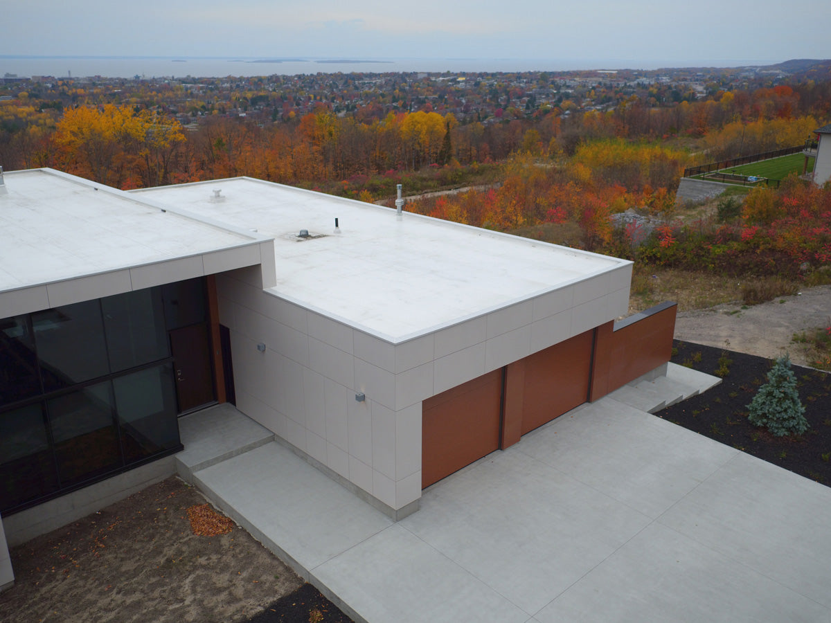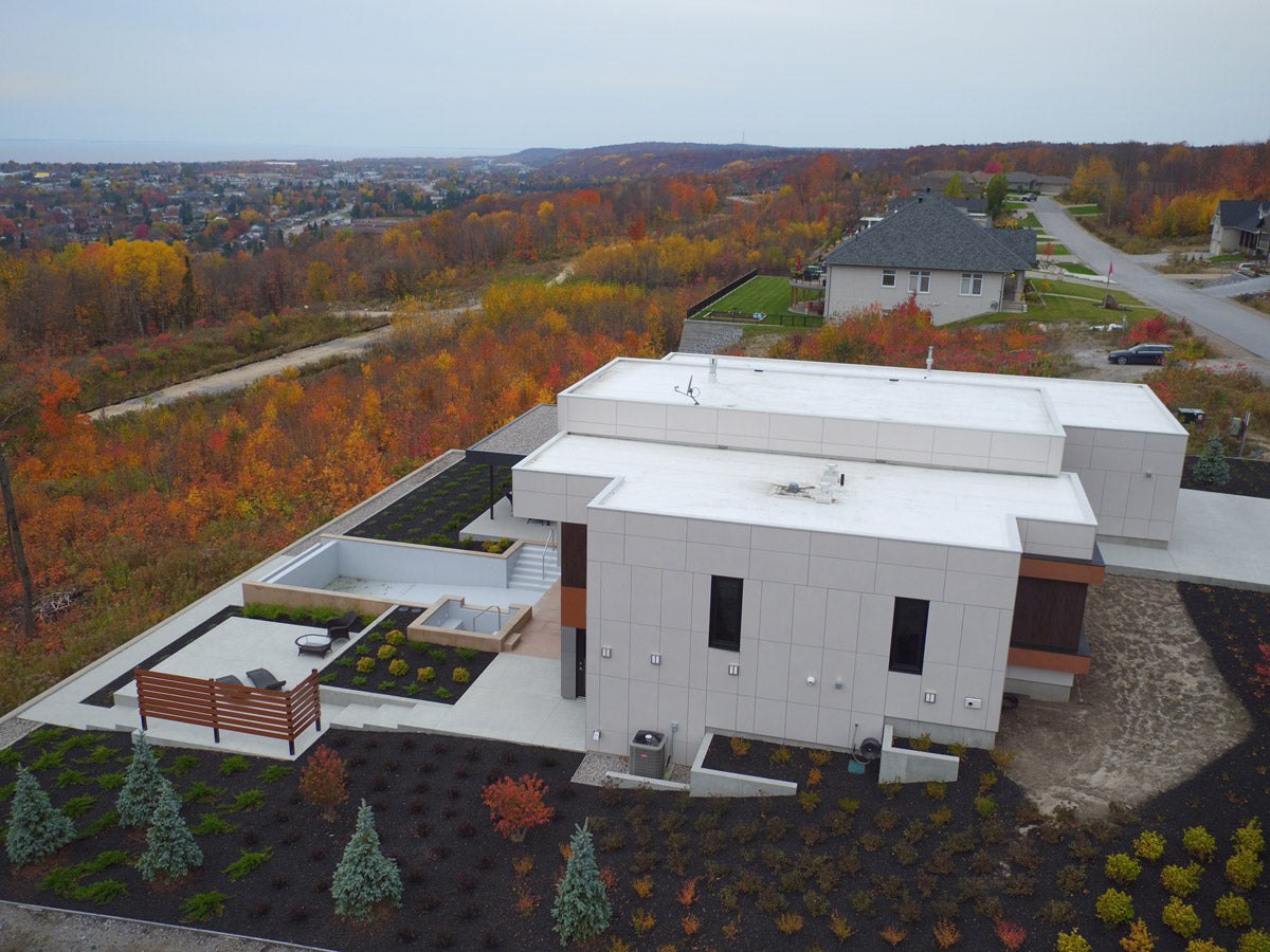 Beautiful custom home in North Bay ON designed by LEA (Larocque Elder Architects). Featuring 2 unique exterior cladding products. White Fiandre porcelain panels and woodgrain HPL(high pressure laminate) panels for accents.