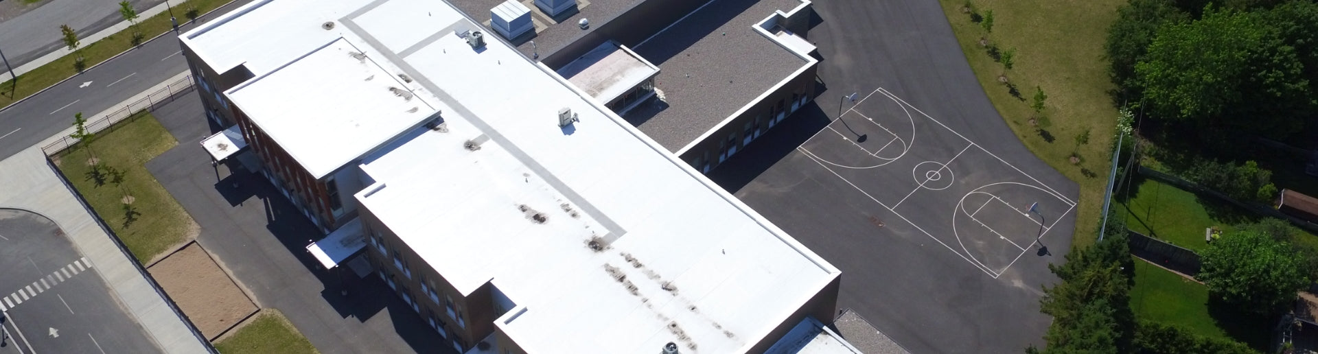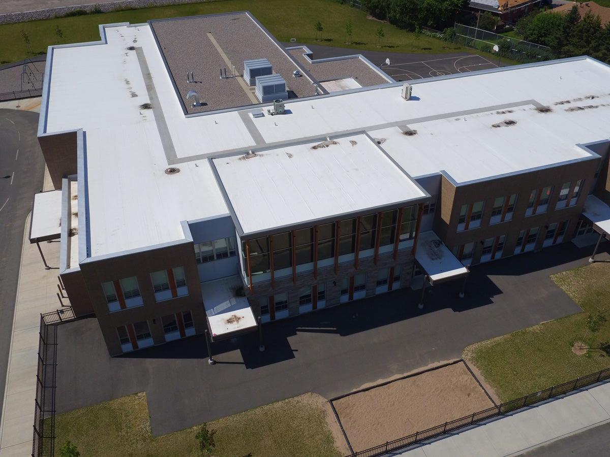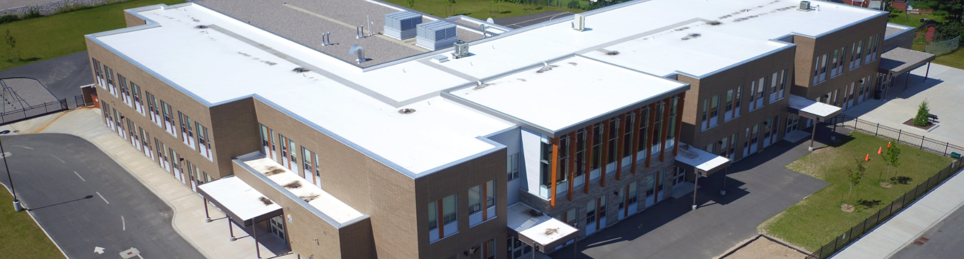 The interior of the school also features the extensive use of maple veneer and solid wood elements; maple veneer wall paneling provides a durable yet beautiful wall finish in high traffic public areas, solid maple benches with maple veneer cubbies above provide a place for students to change their shoes and store their bags, while maple veneer millwork throughout the facility brings a high quality atmosphere to the classrooms and staff spaces. The exterior of the building is also representing the proven performance product, Sika Sarnafil Roofing System.