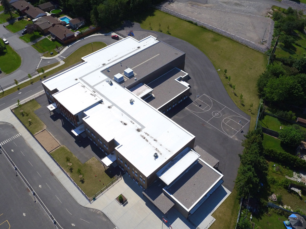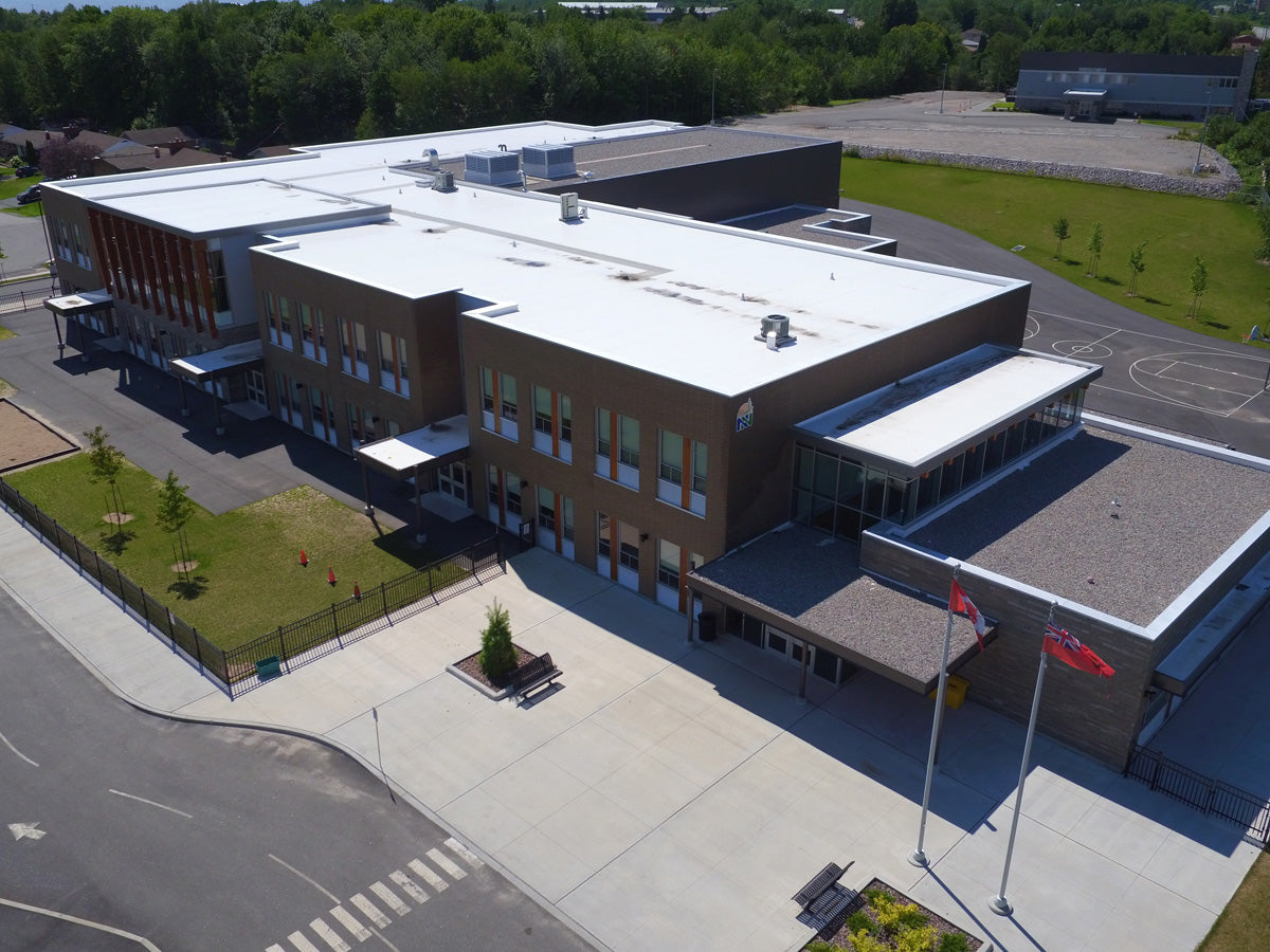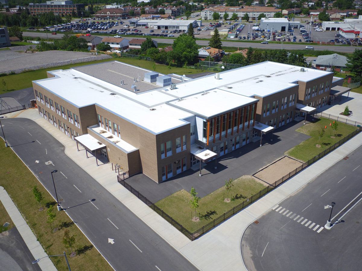 Completed for the Near North District School Board, the building is situated in an established neighbourhood and adjacent to a 17-acre urban park filled with mixed forest and exposed granite outcroppings. The building replaces an aging (and much smaller) school on the same site, and is home to over 500 students in grades ranging from kindergarten to grade six.